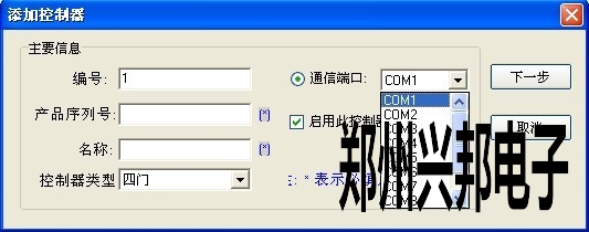 首先選擇好電腦的通訊端口,填寫產(chǎn)品的序列號一般出廠默認設置是0000,然后為設備起個名稱,選擇好所控制門的類型,最后點擊下一步,接著會彈出如圖七所示對話框。