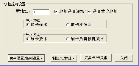 2   水控控制設(shè)置:新地址設(shè)置為1,把地址號(hào)是否遞增和是否重設(shè)機(jī)器號(hào)前面的選項(xiàng)選上,如下圖所示,點(diǎn)擊費(fèi)率設(shè)置|控制設(shè)置卡按鈕,點(diǎn)擊控制設(shè)置卡, 即可成功制作成控制設(shè)置卡去修改聯(lián)網(wǎng)型水控一體機(jī)的機(jī)器號(hào)??刂圃O(shè)置卡在機(jī)器上數(shù)卡成功時(shí)會(huì)提示8 OK  9 OK  10 OK