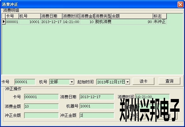 3. 點卡管理--消費沖正,此時把多消費的那張卡放到讀卡器上,然后點讀卡,此時會出現(xiàn)這天這張卡所有的消費記錄,找到消費多扣的那筆記錄,然后雙擊那筆記錄,此時下面就會出現(xiàn)這筆記錄的信息,然后把多消費的金額在沖正金額那輸入即可。(如我這筆消費記錄應該是8元,但是按錯了按成10元,此時我可以沖正2元)