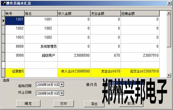 此表用于查詢(xún)出每個(gè)操作員某個(gè)時(shí)間段的的收入,支出金額及所應(yīng)上繳的總金額。