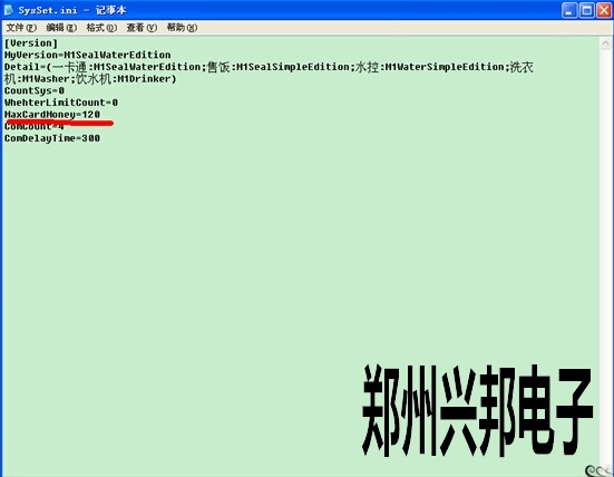 電腦桌面上找到485售飯機軟件圖標,然后光標停在此軟件圖標上右擊--屬性--查找根目錄,點開后打開軟件文件夾,也就是找到帶有軟件圖標的文件夾,然后找到SYSSET.INI此文件,雙擊打開,把MAXCARDMONEY=XX,更改成自己所需要的即可,如下圖:有一卡通,售飯,水控,洗衣機,飲水機等相關的中文數(shù)字,現(xiàn)在只需要把maxcardmoney=120,此時卡上總額最多只能存款為120,超過此金額就無法存款。