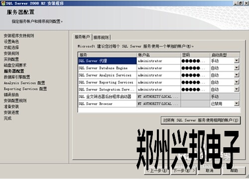 在這里,首先要配置服務器的服務帳戶,也就是讓操作系統(tǒng)用哪個帳戶啟動相應的服務。 為了省事,我們選擇“對所有SQL Server服務使用相同的帳戶”。也可以選擇,NT AUTHORITY\SYSTEM,用最高權(quán)限來運行服務。接著,還要設(shè)備排序規(guī)則,默認是不區(qū)分大小寫的按你的要求自行調(diào)整。