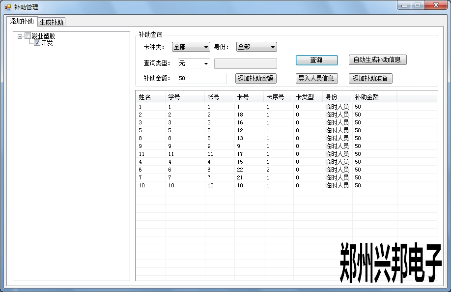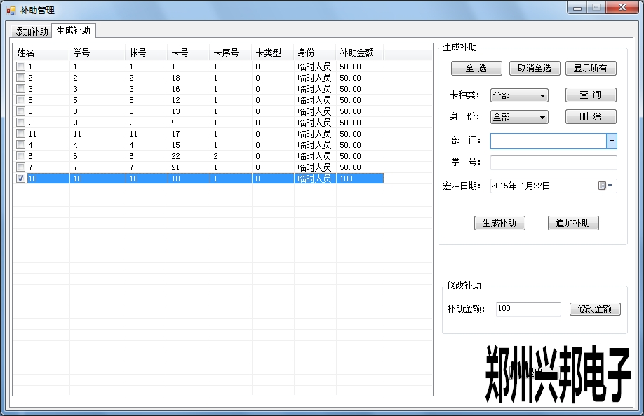 對(duì)于添加完成的補(bǔ)助,進(jìn)行生成補(bǔ)助。對(duì)添加補(bǔ)助的信息可以按照卡種類(lèi),身份,部門(mén),學(xué)號(hào)進(jìn)行查詢(xún)選擇限定條件的人員進(jìn)行補(bǔ)助,選中補(bǔ)助信息可以修改補(bǔ)助金額。選擇刪除后此補(bǔ)助計(jì)劃就沒(méi)有了。