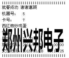 計算模式下按‘+’號鍵可進行取餐,取餐時將需要取餐的卡放到刷卡區(qū),消費機可自動讀取卡片上的訂餐信息,并將其顯示出來,按‘+’號鍵可翻頁查看訂餐信息,按‘確認’可進行取餐,取餐成功后會顯示就餐成功、菜肴名稱、份數(shù)、扣費金額,若連接的有打印機,可打印取餐信息,打印的格式如下圖所示: