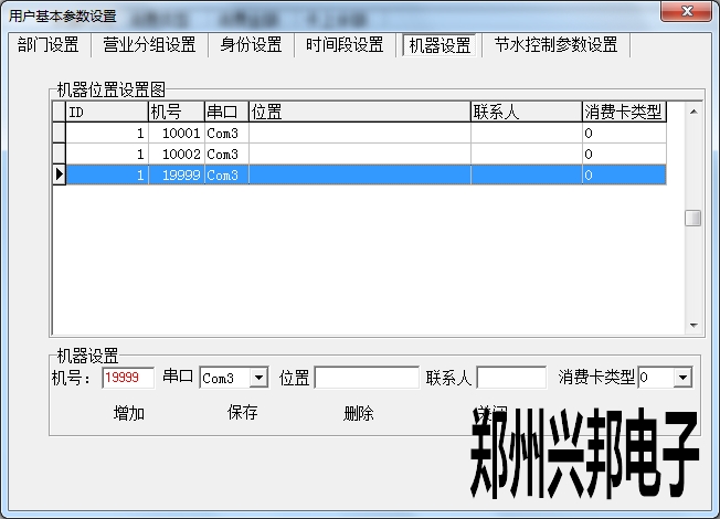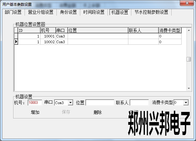 在機(jī)器設(shè)置中可以添加機(jī)器,設(shè)置機(jī)器號(hào)、串口以及消費(fèi)卡類(lèi)型,位置、聯(lián)系人可以選填。其中設(shè)置機(jī)器號(hào)必須輸入5位,開(kāi)頭為1,最大可設(shè)置為19999.串口是指通訊器連接電腦的端口號(hào),此處的串口號(hào)選擇不正確的話(huà)會(huì)導(dǎo)致機(jī)器不通訊。