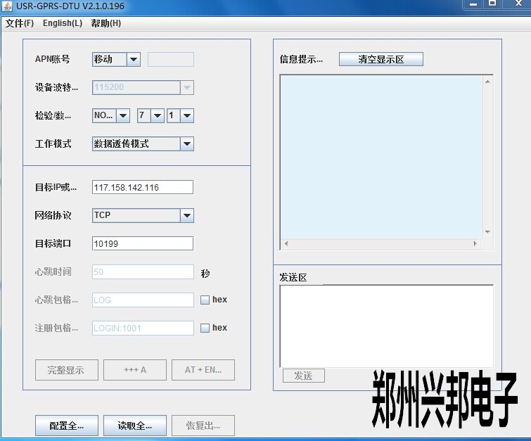 使用方法:我們可以看到左下角有一個(gè)配置參數(shù)和讀取參數(shù)按鈕,點(diǎn)擊配置參數(shù),會(huì)把我們填寫(xiě)的目標(biāo)IP、端口號(hào)、網(wǎng)絡(luò)協(xié)議配置到服務(wù)器上,服務(wù)器接收到會(huì)返回相應(yīng)的信息告訴用戶配置成功。讀取配置參數(shù)同理,會(huì)向服務(wù)器發(fā)送一串?dāng)?shù)據(jù)告訴服務(wù)器要執(zhí)行的操作,服務(wù)器也會(huì)返回?cái)?shù)據(jù),根據(jù)接收到的數(shù)據(jù)吧目標(biāo)IP、端口號(hào)、網(wǎng)絡(luò)協(xié)議顯示到界面上來(lái),表示讀取參數(shù)成功。