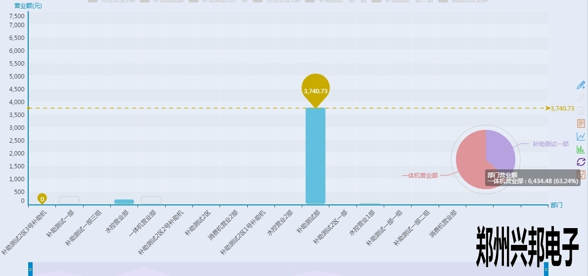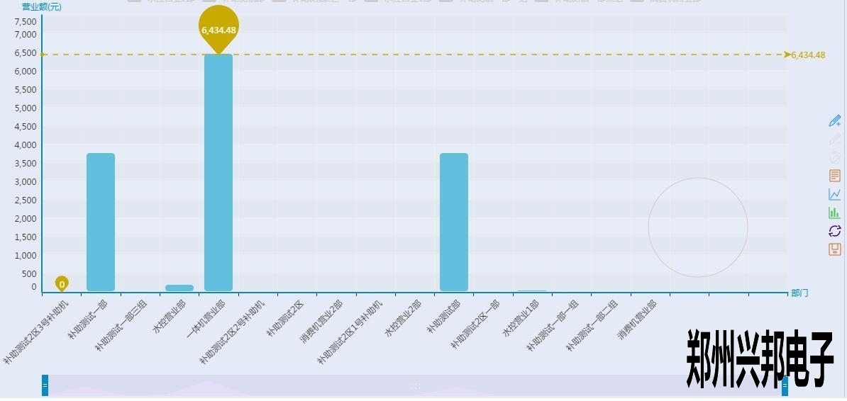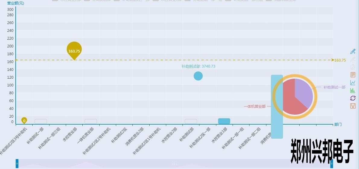 看上起跟終端營(yíng)業(yè)圖表差不多,但是有沒有注意到有一根和終端營(yíng)業(yè)分析圖不一樣樣色的虛線?這是這個(gè)圖表里面的最大值,也就是營(yíng)業(yè)額最高的部門,當(dāng)然下面的工具條也可以像終端營(yíng)業(yè)分析圖一樣的滑動(dòng)來(lái)看某個(gè)具體的柱圖,不過(guò)你又沒有注意到后面還有一個(gè)圈?對(duì)那是一個(gè)圈圈,有什么用呢?來(lái)看一下下面的圖形: