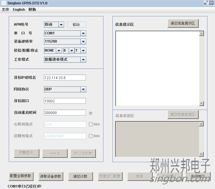 將編程器TR101插入GPRS配置接口,打開配置工具,選擇相應(yīng)串口,點(diǎn)擊“讀取設(shè)備參數(shù)”。