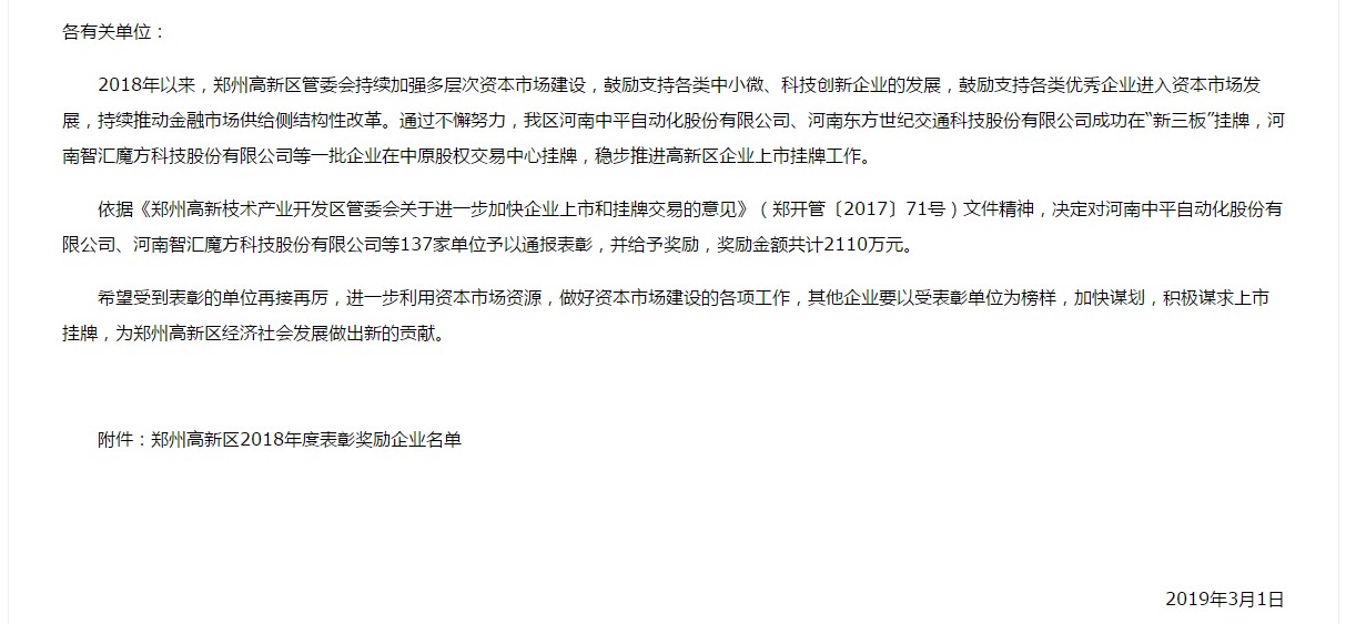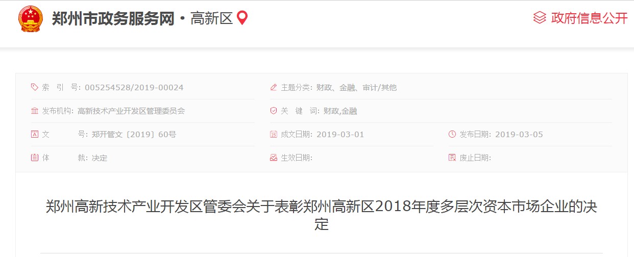 轉(zhuǎn)發(fā):鄭州高新技術產(chǎn)業(yè)開發(fā)區(qū)管委會關于表彰鄭州高新區(qū)2018年度多層次資本市場企業(yè)的決定