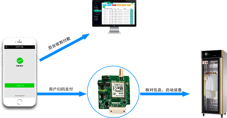 共享干衣機采用無人經(jīng)營模式,用戶使用掃碼支付使用,運營商則借助云管理平臺實現(xiàn)遠程管理。